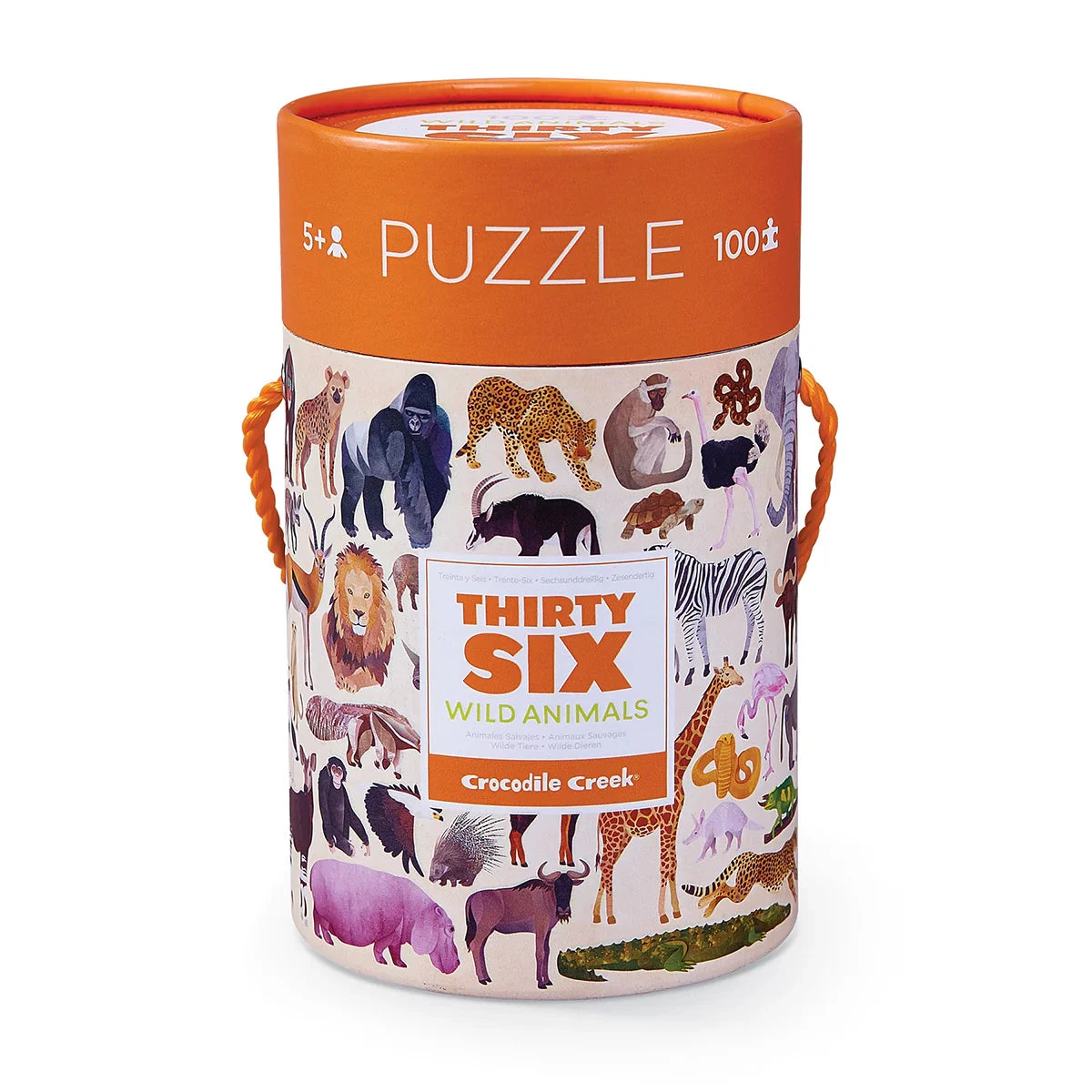 Learn about 36 different wild animals that roam the world in this highlight detailed and challenging 100 piece jigsaw puzzle from Crocodile Creek. Suited perfectly for family fun – and of course for the animal lovers! sturdy canister doubles as storage when not in use. Each puzzle comes with a naming sheet to help you learn about the different wild animals featured. Other animal options available from Crocodile Creek.