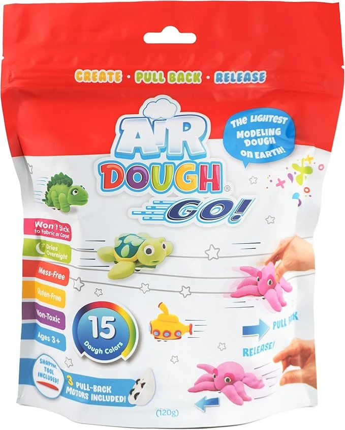 - The Air Dough GO! – Create Kit contains 1 sculpting tool, 3 pull-back motors, and 16 air dough colors.