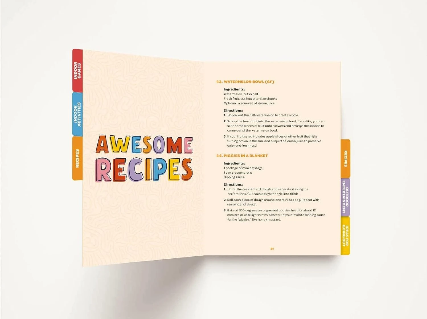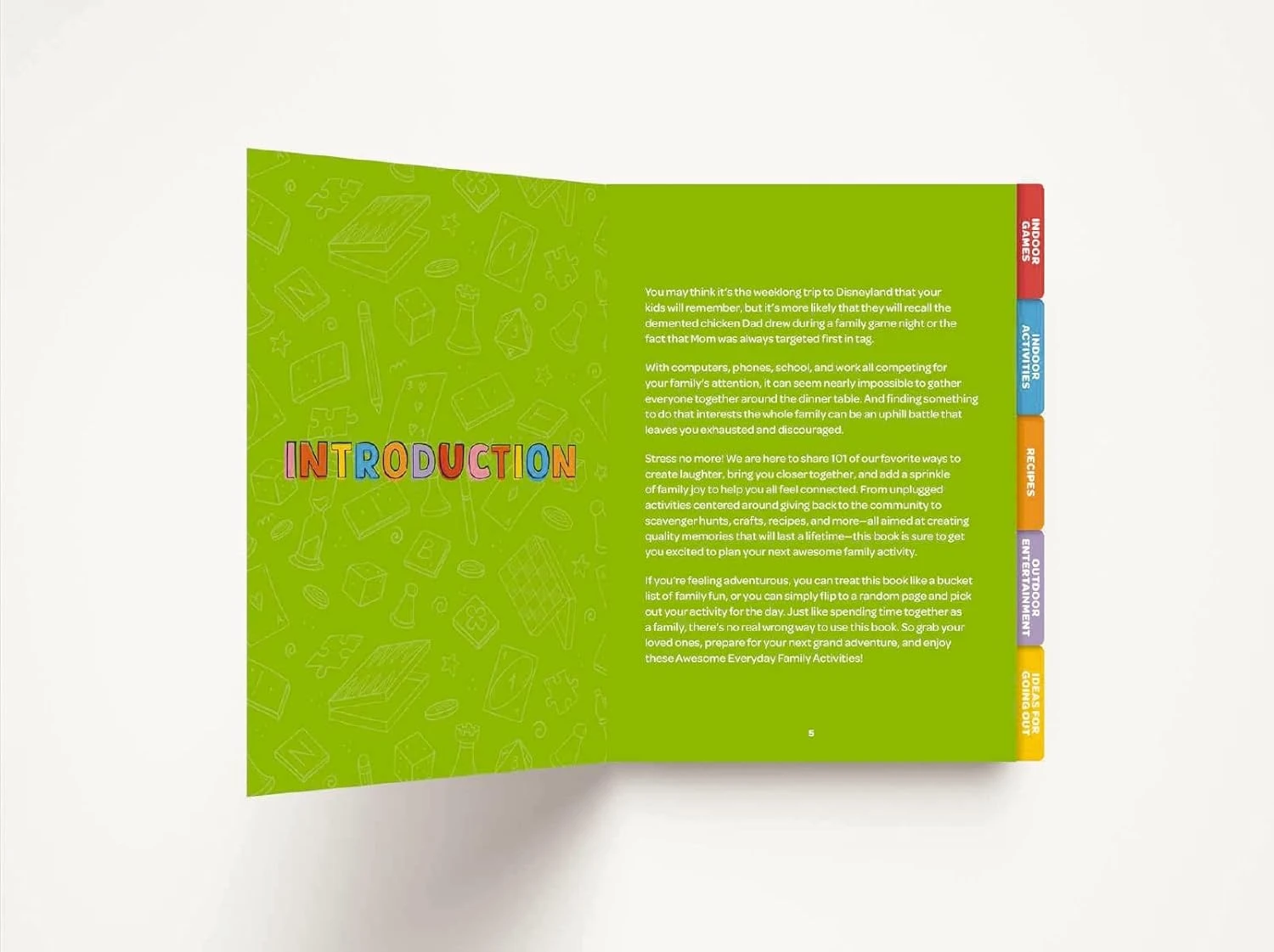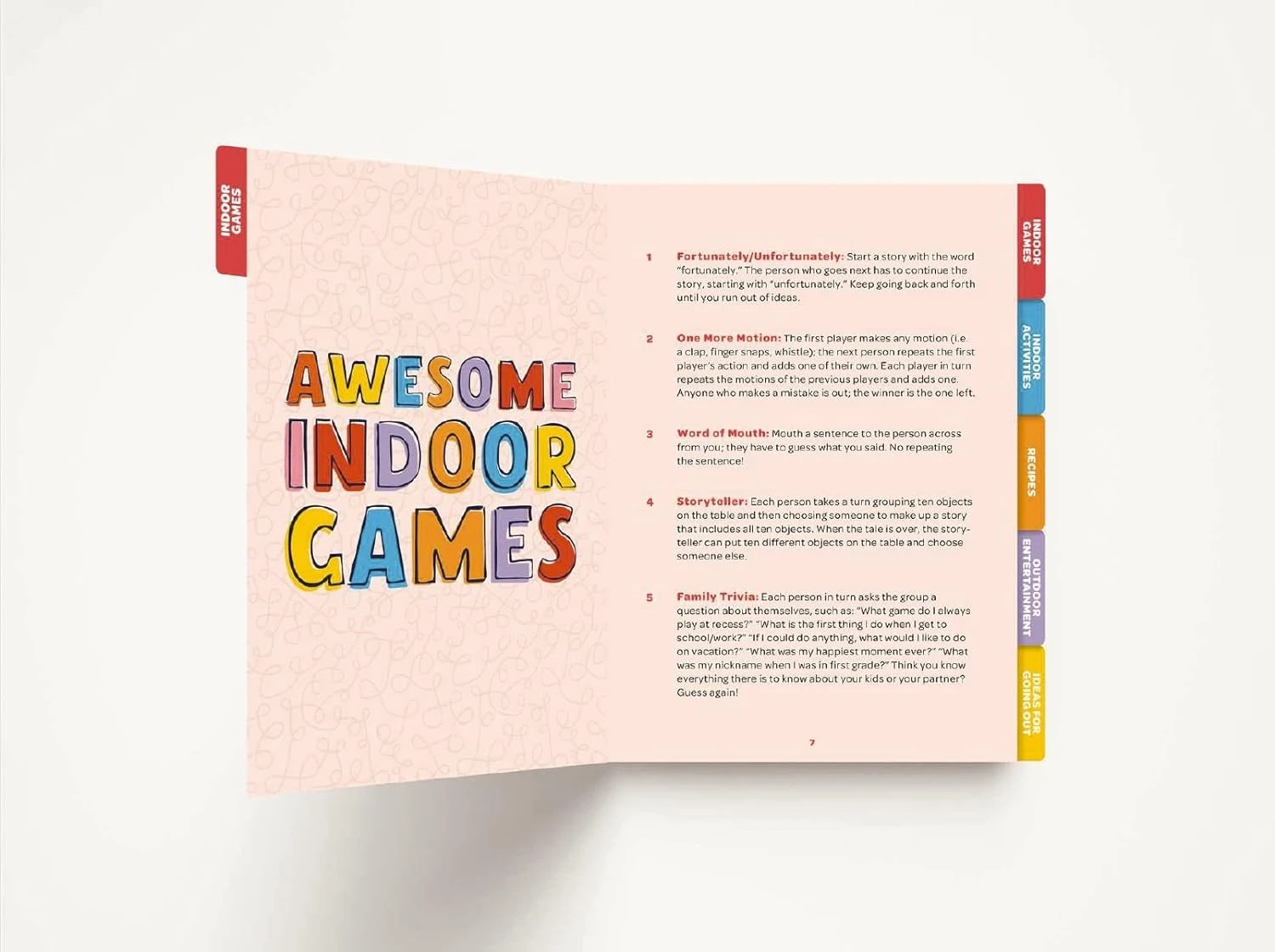 Plan your next family adventure and never get stuck with bored kids again with Everyday Family Activities. With over 100 unplugged activities, there’s something here for everyone. You’ll never be wanting for things to do as a family, no matter the situation. With tabs on the side for quick and easy navigation when you just don’t know what to do next, you’ll be able to find activities for all occasions, including: