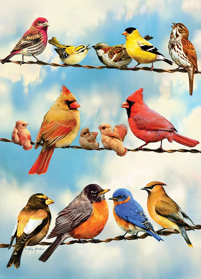 It’s a city bird council meeting and the cute winged creatures have come from everywhere. These Birds on a Wire are wondering about their fate with the new trend of going wireless. Their wee chicks may never know the joy of a telephone pole.