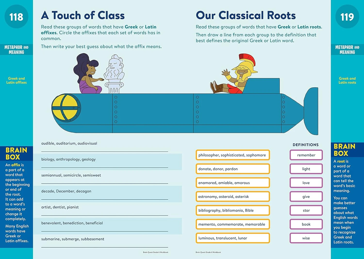 Loved by kids, teacher approved, and trusted by parents, Brain Quest Grade 6 Workbook reviews and reinforces what children are learning in the classroom in an instantly engaging, entertaining way. Each page is jam packed with fun activities, practice exercises, and games covering spelling and vocabulary, language arts, math word problems, multiplication and division, fractions and decimals, geometry and measurement, statistics, social studies, science, and much more.