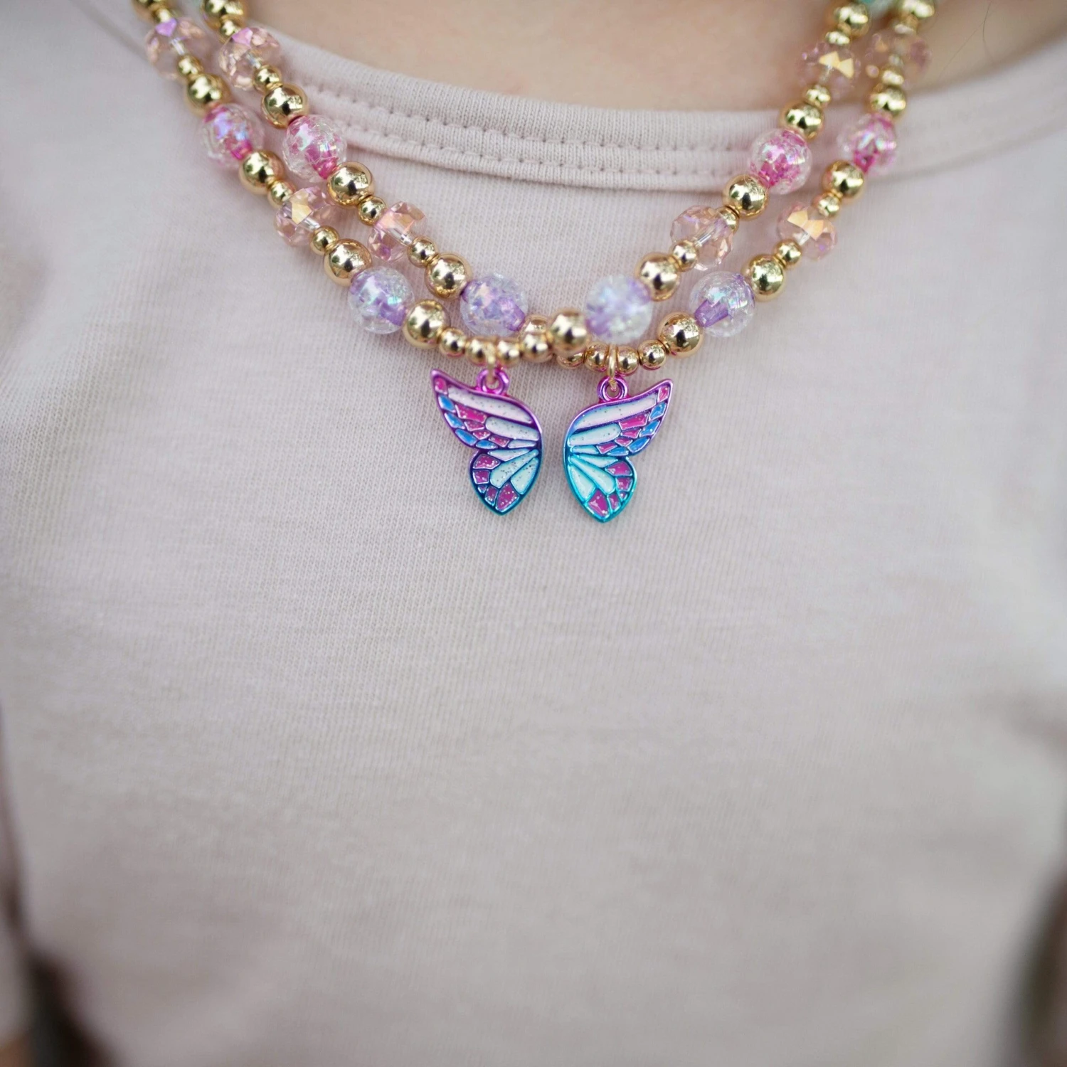 Share the love with your bestie with our Butterfly Wishes BFF necklaces! This set includes two gold-toned beaded necklaces, with half a butterfly pendant with a gold BFF heart on each. Our children’s jewelry is strung with double elastic to add extra durability.