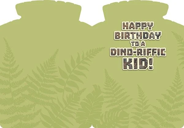Inside greeting: “happy birthday to a dino-riffic kid!”
