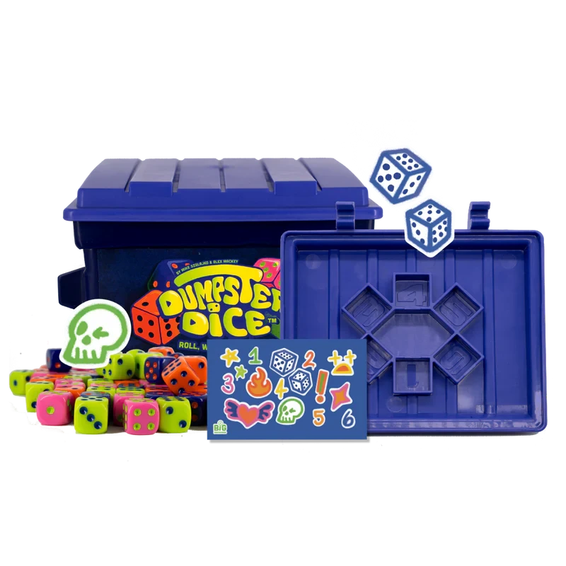 Roll, win, and avoid the bin! In Dumpster Dice, roll to complete the numbered spaces on the lid while avoiding sending your dice to the dreaded dumpster. Dumpster Dice is an easy-to-learn, fast-paced game. With multiple ways to play, it’s perfect for family game nights. Combine it with Trash Dice for a bigger, crazier experience!