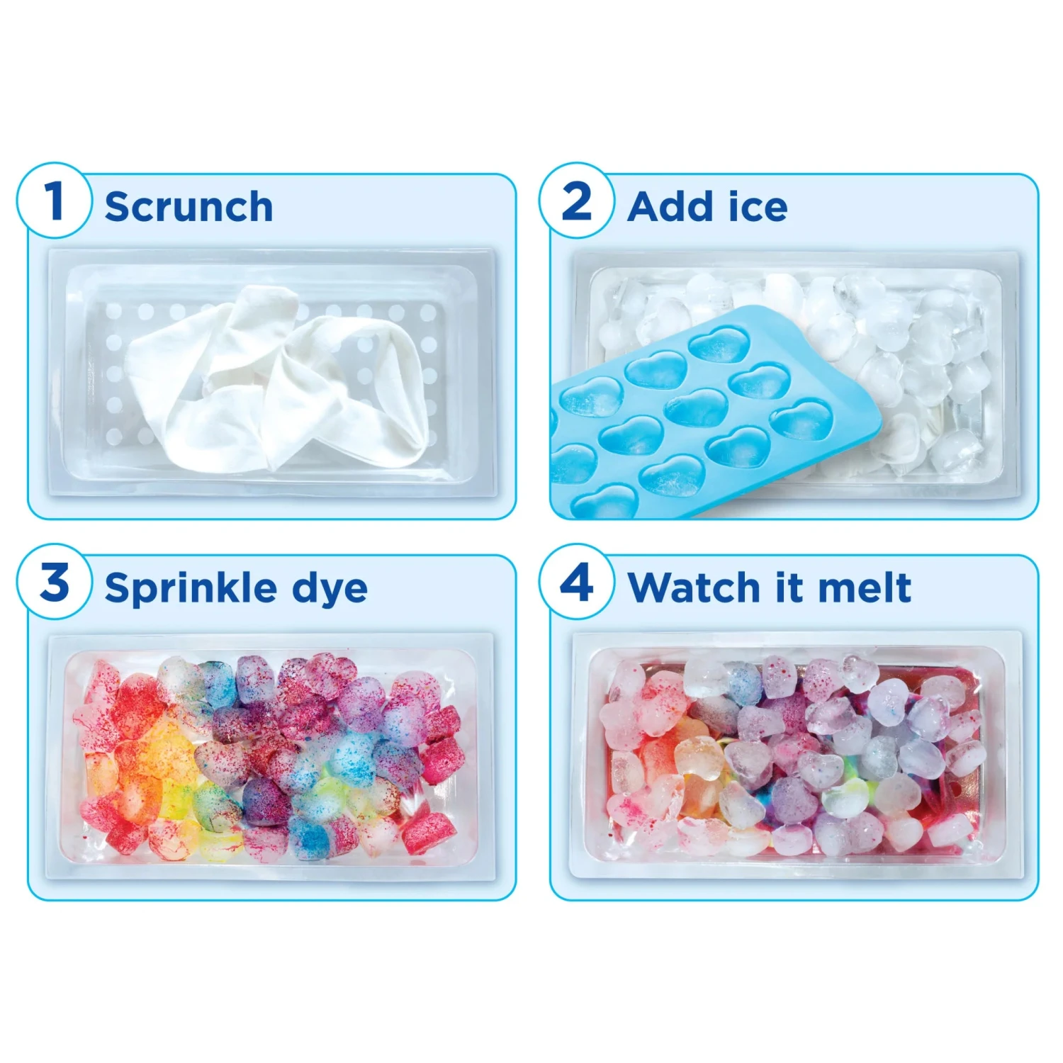 Contents Include: 2 printed headbands, 3 blank headbands, heart-shaped ice cube tray, 4 colors of powdered dye, 2 piece ice dye bin, gloves, table cover
