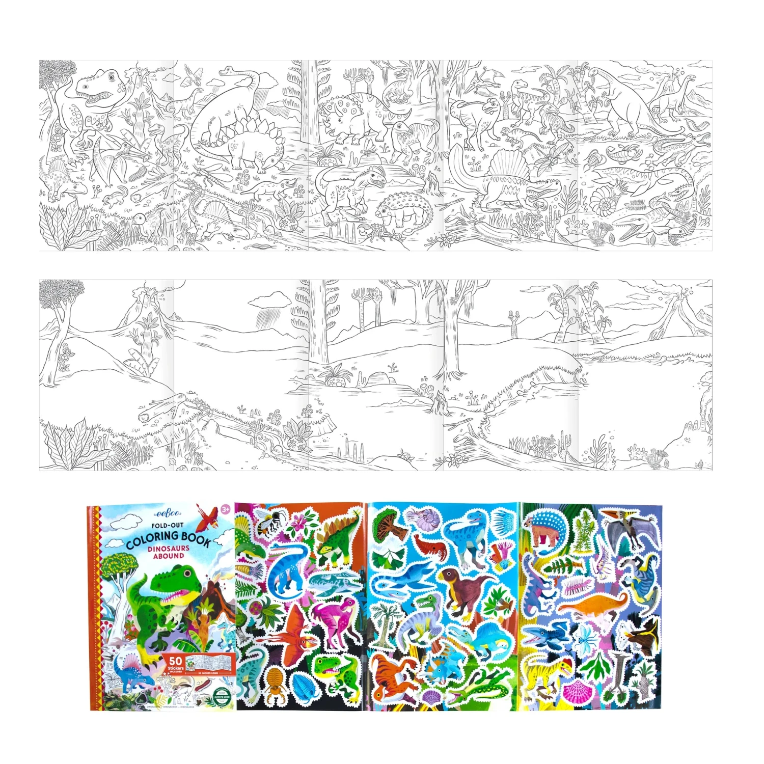 Linda Bleck’s intricate dinosaur mural folds out for an amazing, oversized coloring experience. The back offers an additional illustrated landscape perfect for coloring and stickering!