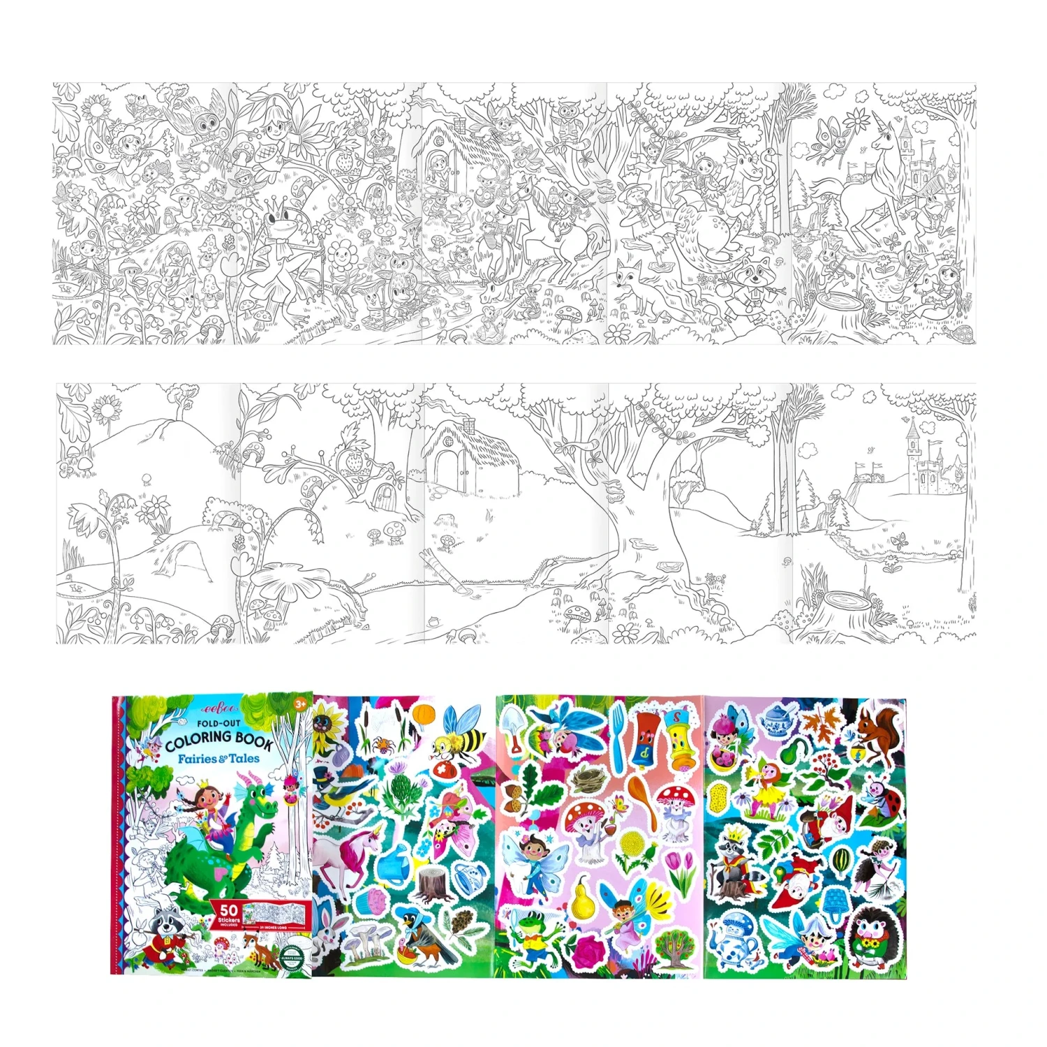 •Fold out coloring mural, front for coloring, back for coloring and stickering; Includes 50 shiny stickers