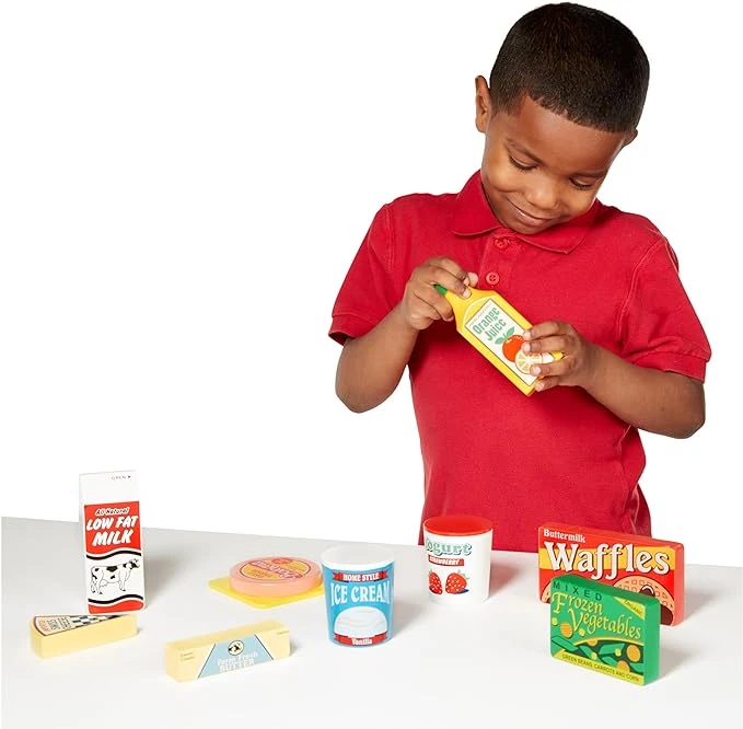 - COLD FOOD WOODEN PLAY SET: The Melissa & Doug Fridge Food Wooden Play Food Set includes items kids can find in a refrigerator like waffles, milk, ice cream, Swiss cheese, butter, frozen vegetables, orange juice, and yogurt.