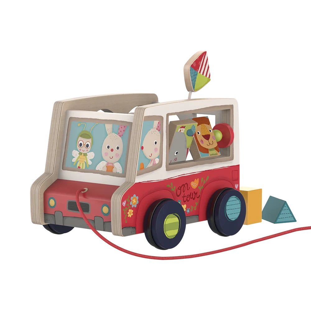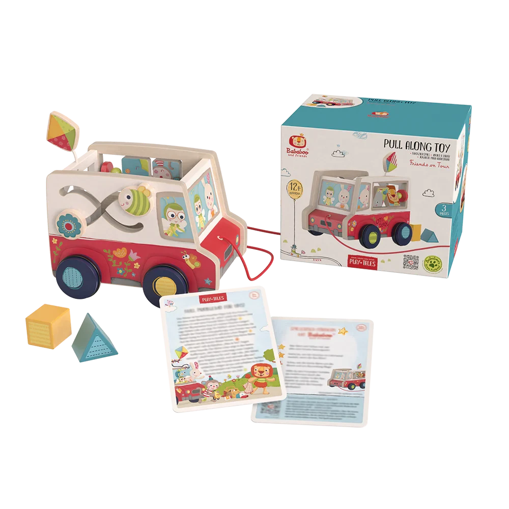 The Pull Along Toy “Friends on Tour” is a fun-filled exploratory pulling toy with Bababoo and his friends. Apart from favorite cuddly toys, two colorful blocks can be loaded and unloaded. Creative objects are attached to the bus to promote fine motor skills and hand-eye coordination. The lively colors and integrated sorting box encourage shape recognition and promote spatial thinking during playtime!