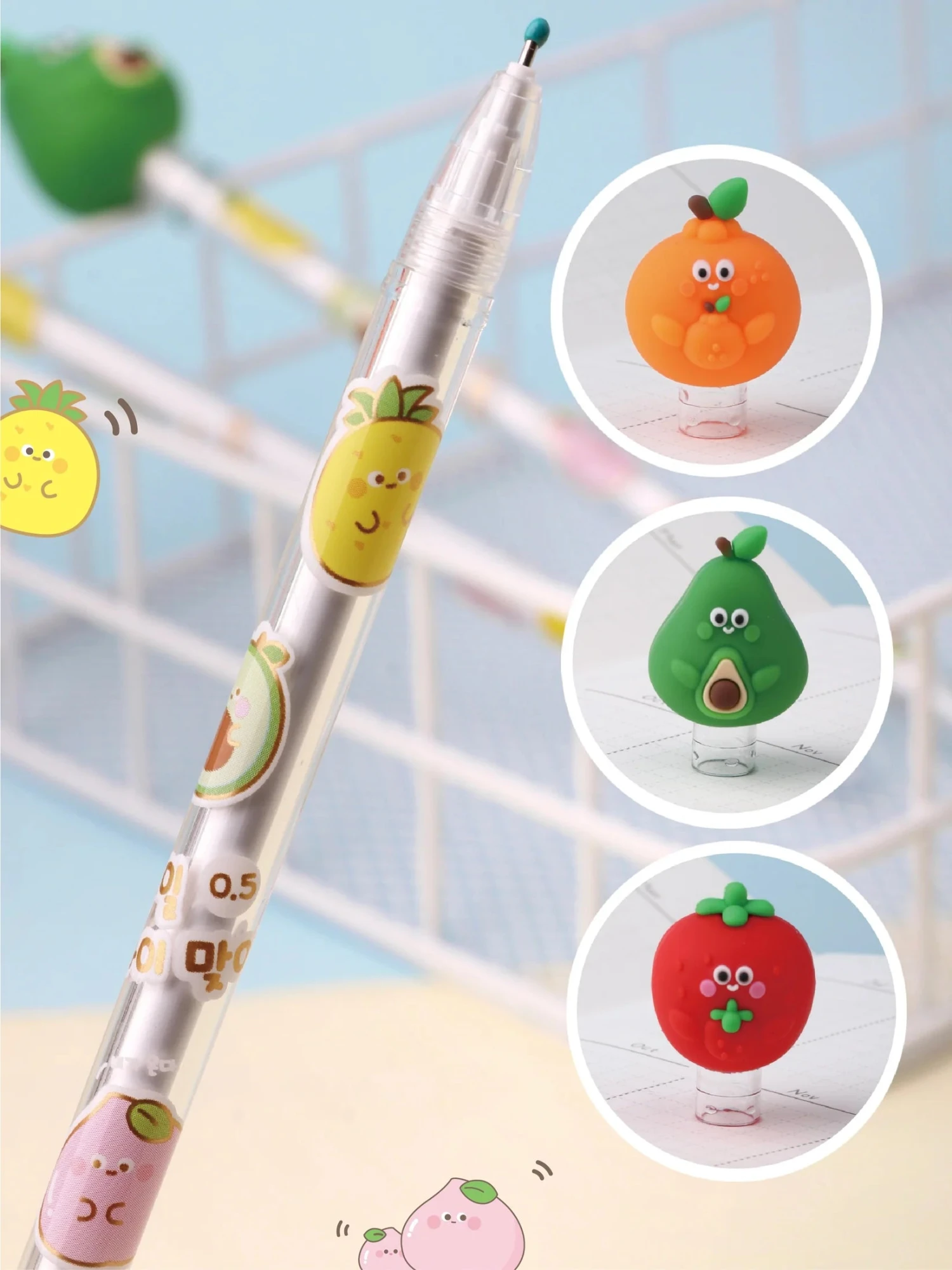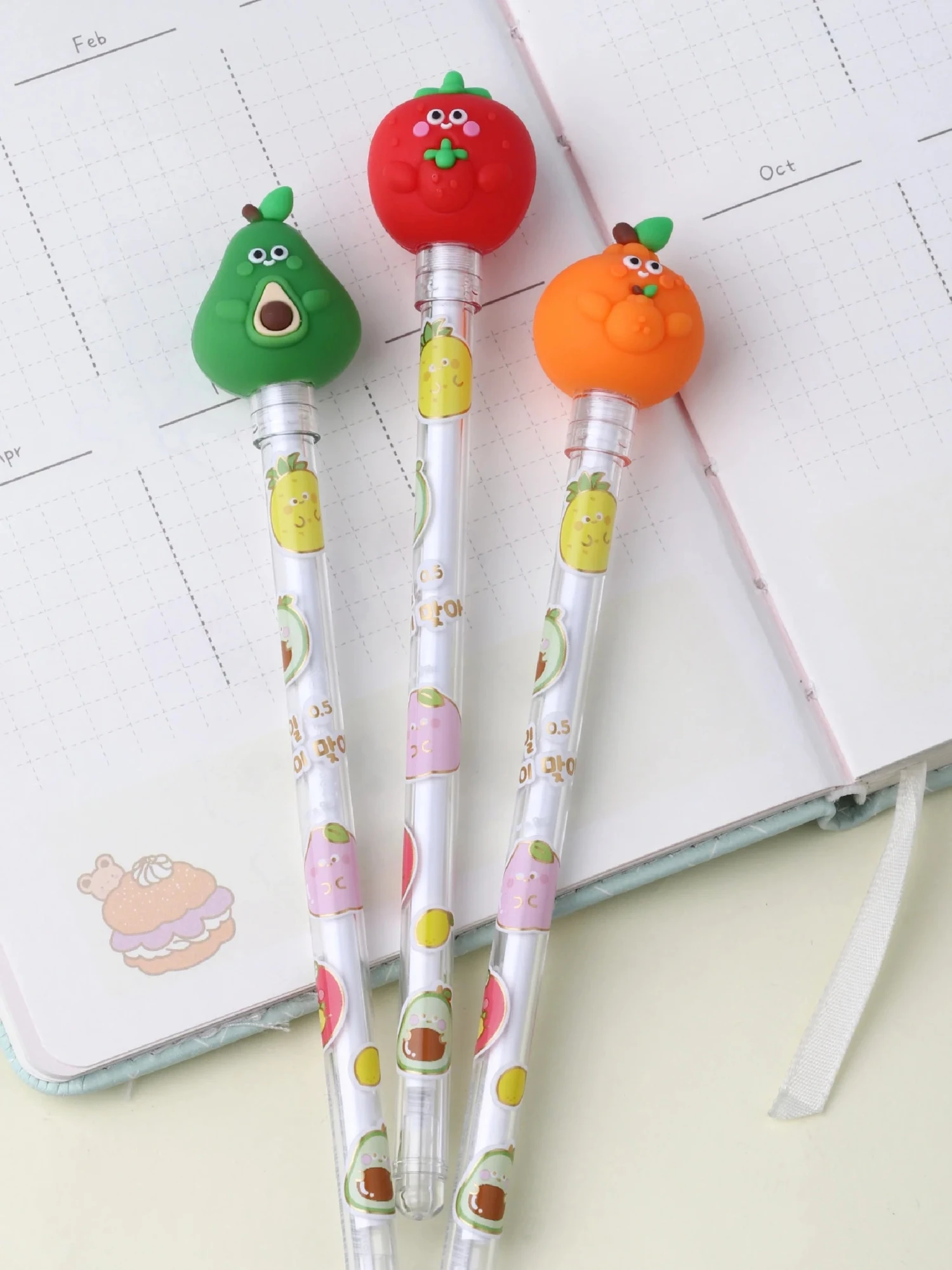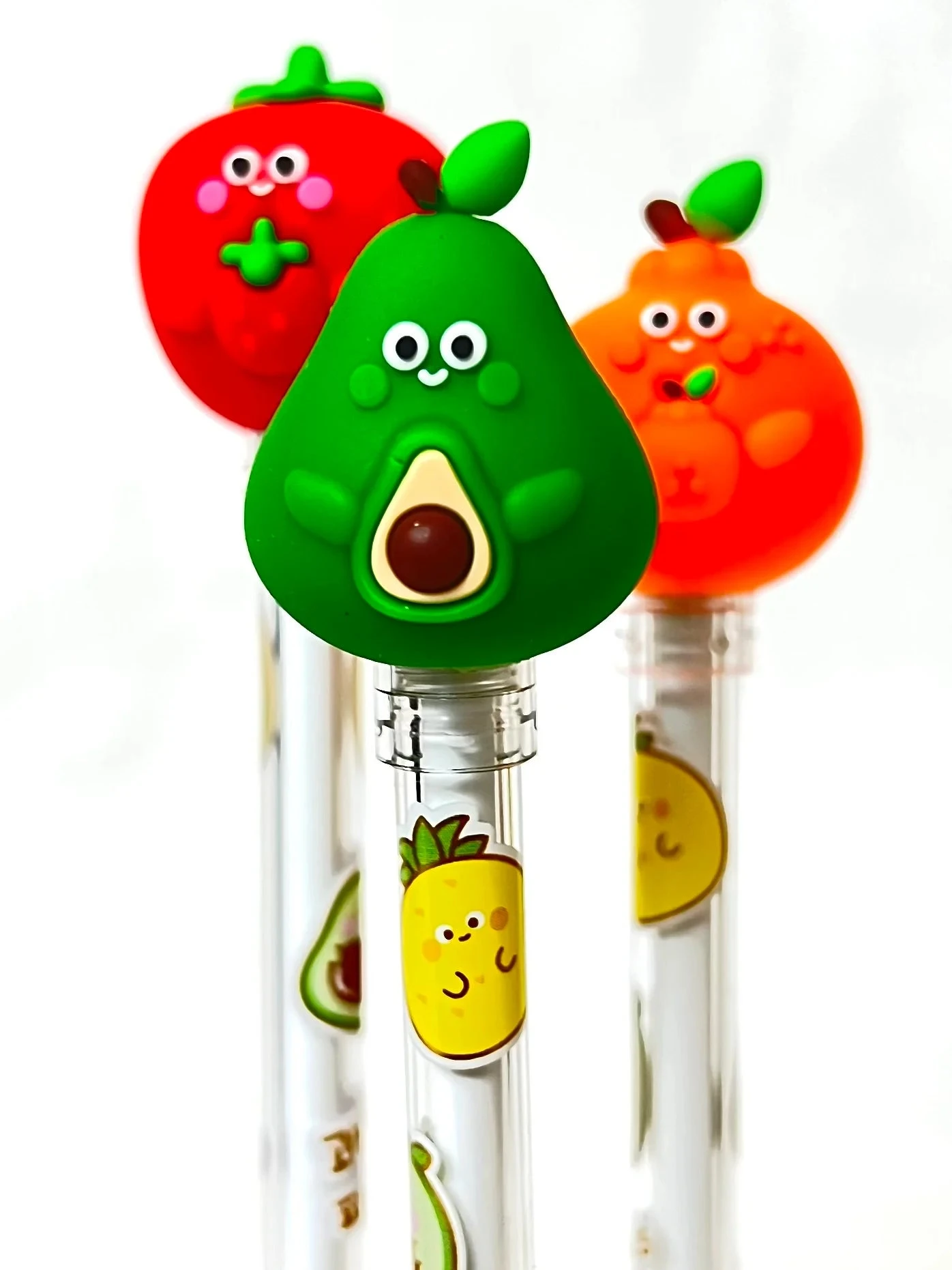 The fruit buddies gel pen uses a gel-based ink, combining the permanence of oil-based ballpoint ink and the smooth glide of water-based ink, in which pigment is suspended in a water-based gel. Gel ink is thick and opaque, it shows up more clearly on dark or slick surfaces than the typical inks used in ballpoint or felt tip pens.