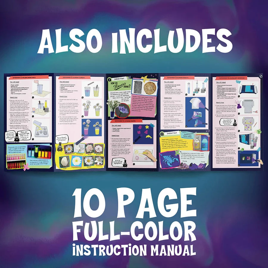 It’s glow time! Conduct fun and illuminating experiments with glowing substances and neon pigments with this exciting (and educational!) science kit. Discover the chemistry of glowing materials as you cast your own neon sidewalk chalk in fun shapes like stars, crystals, and frogs. Learn about light and phosphorescence as you make flowers that glow in the dark and mix up a solution to make your own radiant glow sticks! You can observe your glowing creations under the included UV flashlight and create your own blacklight showcase to display them. Includes two glowing pigments, UV flashlight, glow-in-the-dark star stickers, plaster for chalk, and tools and instructions. The kit box doubles as a blacklight showcase.