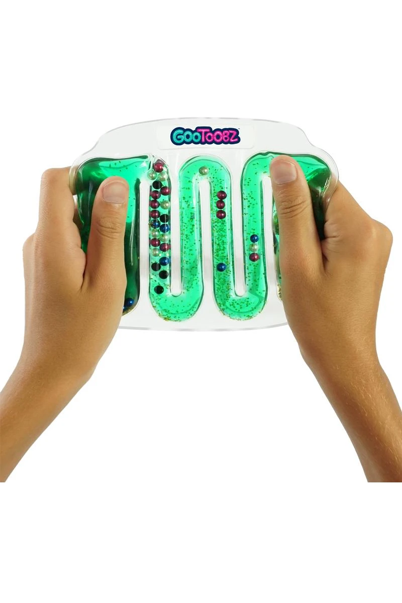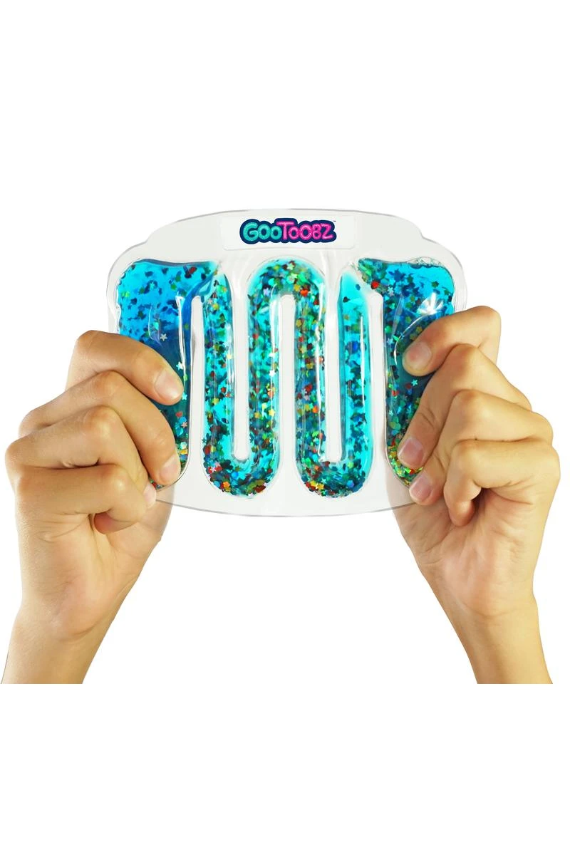GooToobz™ has a patent-pending maze design that creates a vibration-like effect in your hands when the solution inside rushes from one reservoir to the other. Enjoy a Triple-Sensory Experience as you HEAR the audible sound of the beads flowing through the maze, FEEL the squish of the gel being pumped in your hands and SEE the mesmerizing glitter goo flow through the channels!