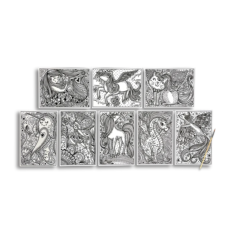 Hidden beneath the black lines in each of these eight illustrations is the paint that will turn this black and white picture into a vibrant art print! Simply use the included paintbrush to brush water onto the reveal sheets to make them come to colorful life. These magic painting sheets are extra special because each design features an adorable, mythical creature! Meet a sweet unicorn, a shy dragon, a happy mermaid, and more! This coterie of delightful characters is just waiting to show its true colors and adorn your child’s walls!