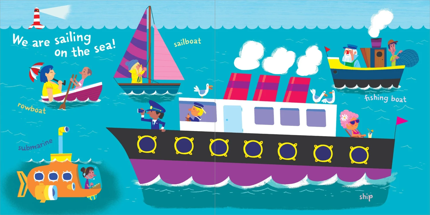 Baby’s sailing on the sea—along with a ship, a sailboat, and a submarine!