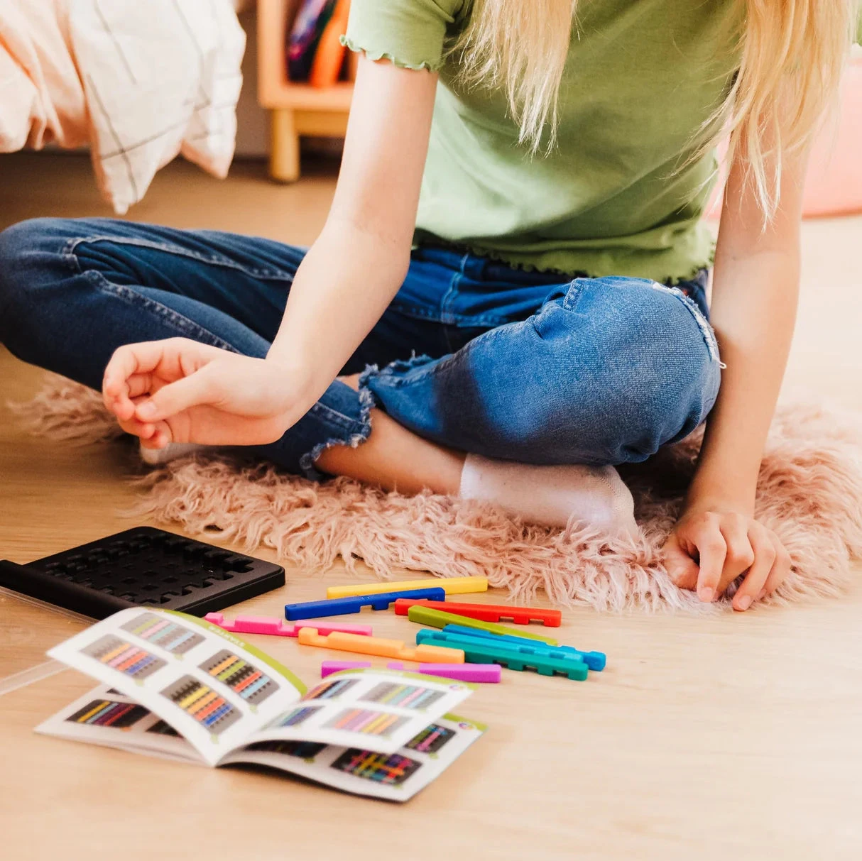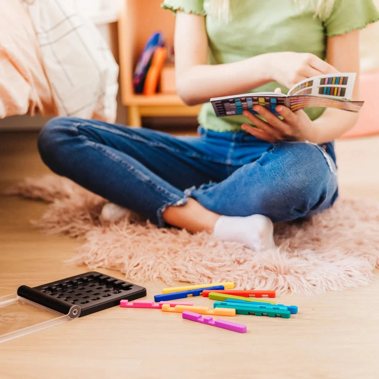 - Set Includes: 1 compact game board with transparent lid, 10 colorful numerical puzzle ‘stixx’ with indentations, and 1 booklet with 120 challenges and solutions.