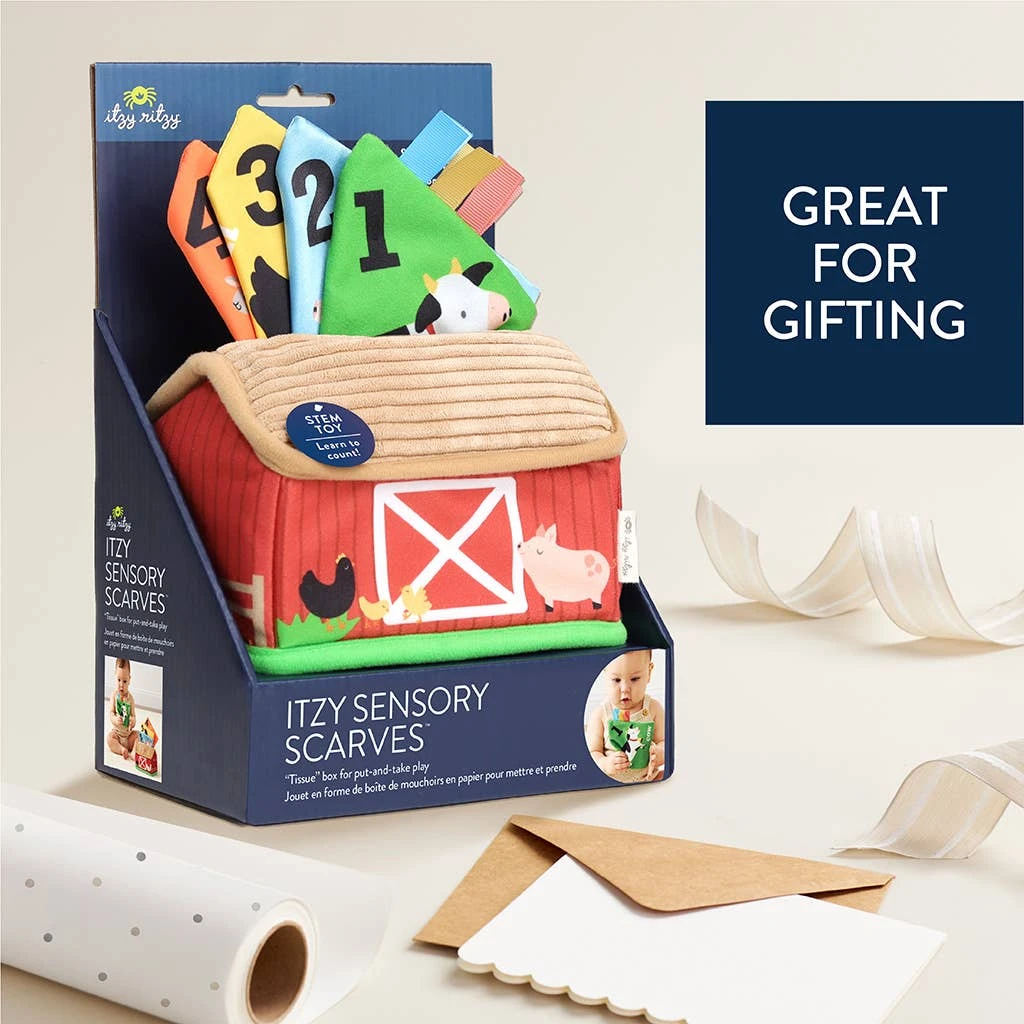 Babies love to pull scarves from a “tissue” box. Our farm themed Itzy Sensory Scarves will entertain and teach. Develop hand-eye coordination and fine motor skills with our adorable Itzy Sensory Scarves. Includes 4 soft scarves with learning features including animals, numbers, colors, and textures.