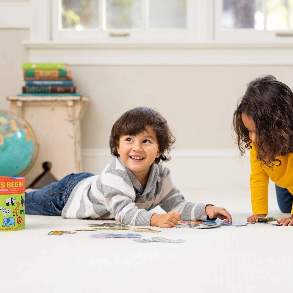 Crocodile Creek Let’s Begin puzzles are perfect for a toddler’s very first learning experience! Each puzzle set is cleverly packaged in a sturdy canister with a rope handle and a puzzle piece on the outside to show puzzle quality on the inside.