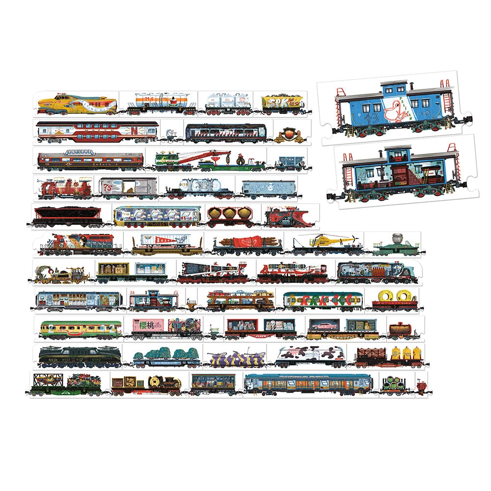 These unique puzzles feature double-sided pieces that can be freely combined. Mix, match, and create! Beautifully and intricately illustrated, the puzzles let you peek inside the train cars and locomotives, and you can build a train up to 21ft. 3″ / 6.5 meters long! This educational set, complete with a poster filled with fun facts, is the perfect gift for all train, transportation, and engineering enthusiasts.