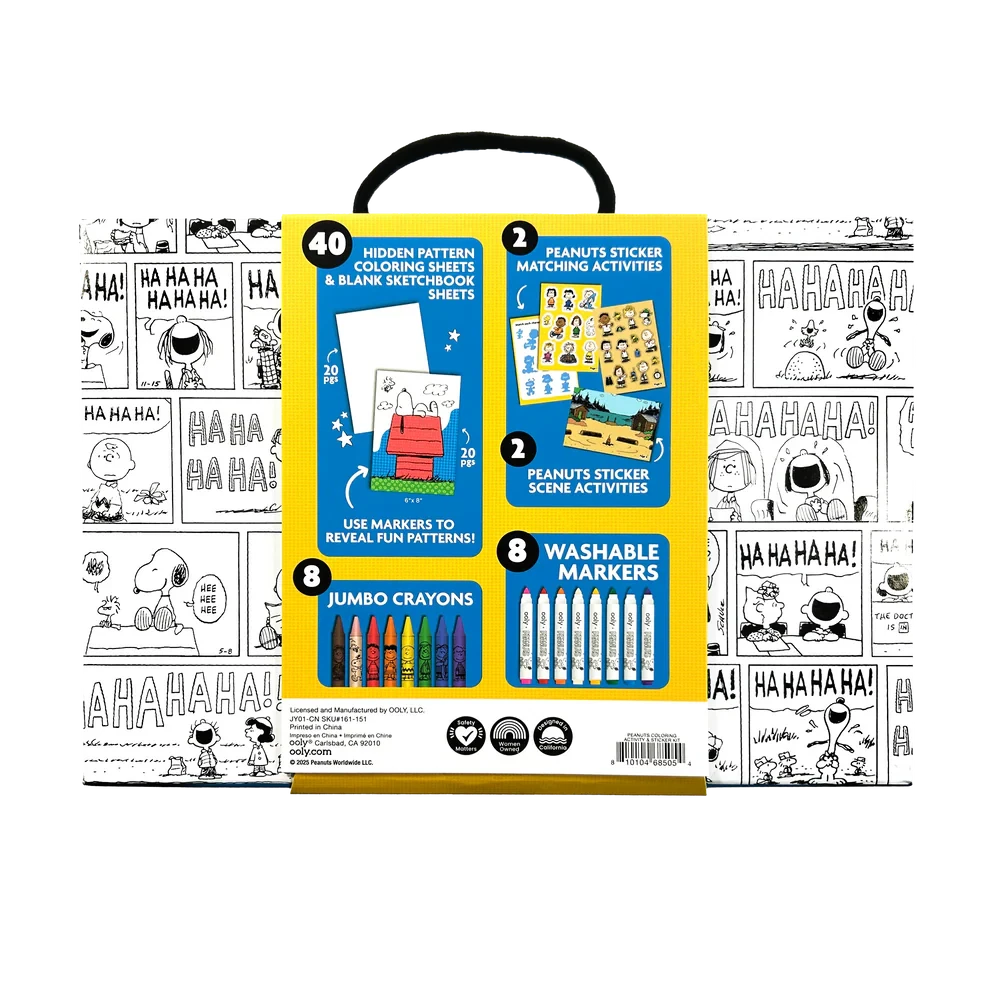Perfect for travel, family craft time, or school projects, this Peanuts coloring activity kit is neatly packed in a portable Peanuts-themed carrying case that’s colorable!