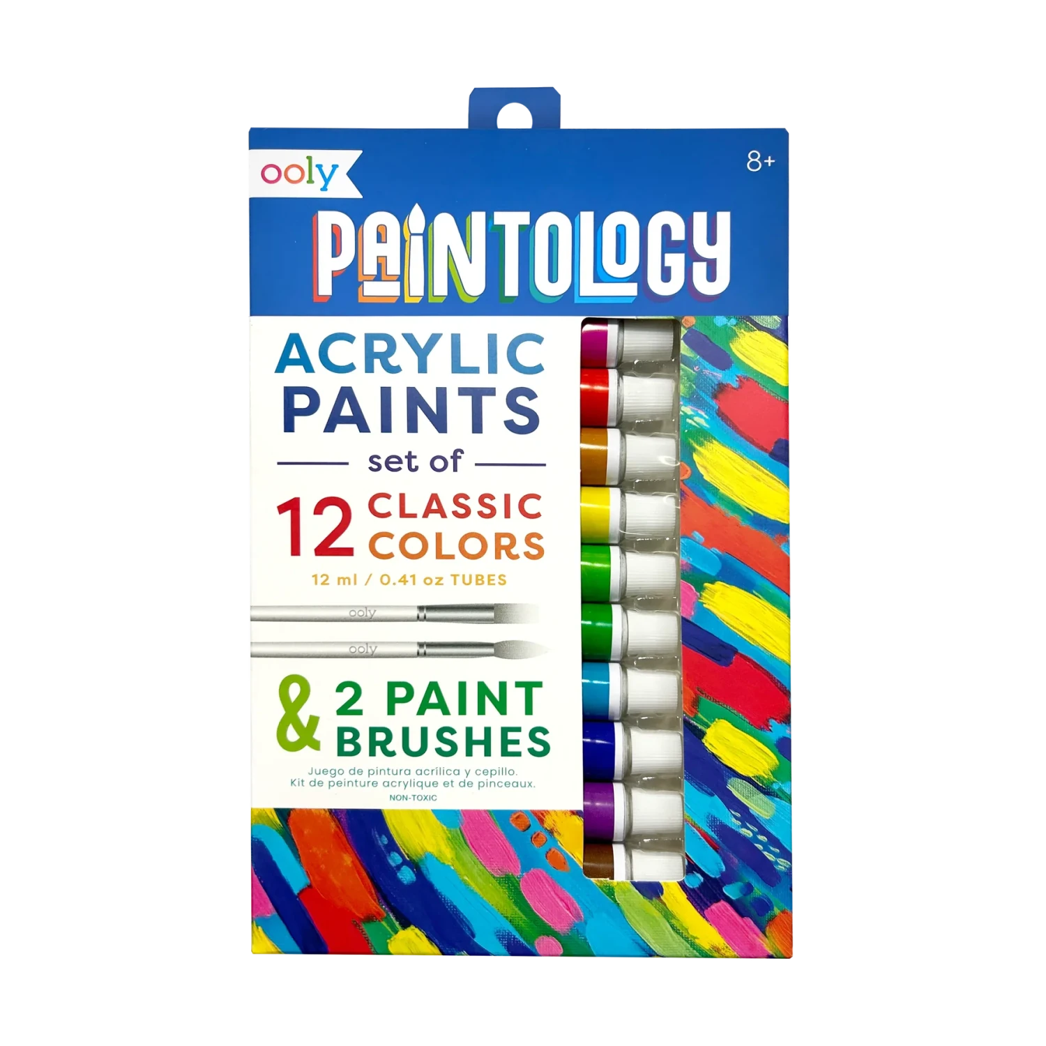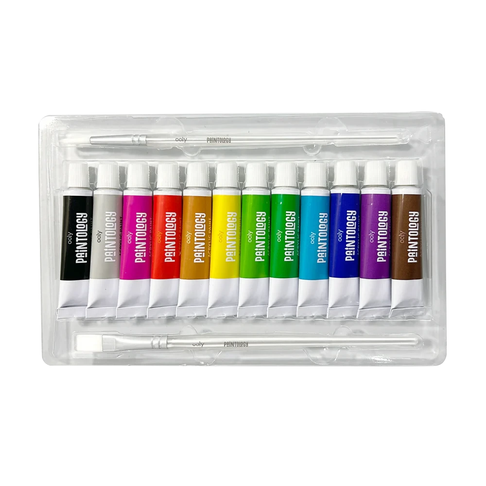 - Kit includes 12 acrylic colored paint tubes, 2 paint brushes (one thin and one broad)
