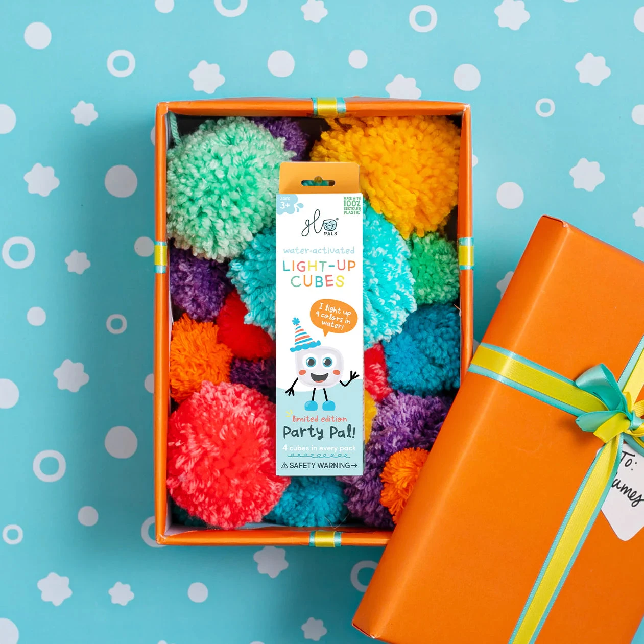Meet Party Pal! Party Pal has the only light up cubes that automatically change colors when placed in liquid. This Pal cycles through 9 multicolored light sequences so every day in the bath tub is a party! Each Pal typically lasts for 4+ weeks on average and each pack comes with four Pals inside.