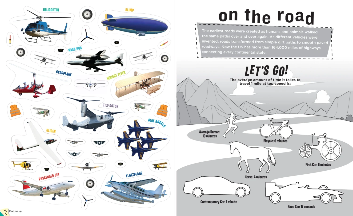 On your mark! Get set! Go! With hundreds of stickers featuring vehicles of all shapes and sizes, from the space shuttle to the horse and buggy, muscle cars to pirate ships, ice cream trucks, submarines, Zambonis, and more. Plus, put on an airshow, build a train, win a boat race, and invent a brand-new vehicle as you learn about the machines that take us over land, across the water, through the sky, and all around the world!