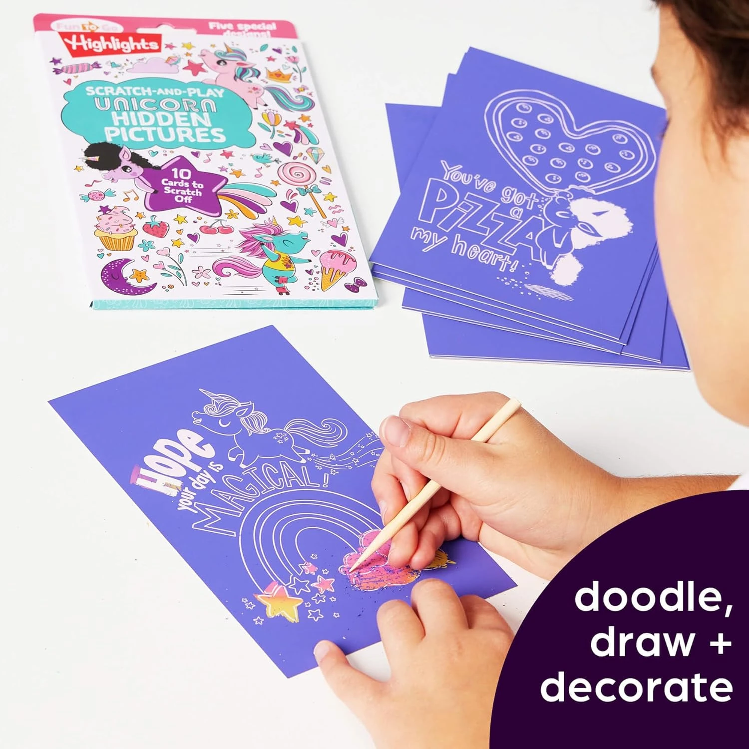 Make some magic with this scratch-and-play unicorn set! Puzzlers ages 6 and up can scratch off their own messages and solve puzzles on 10 illustrated cards. One side is a scratch-off design, the other is a Hidden Pictures puzzle to solve. With two cards of each design, kids can scratch one card to share and one to keep!