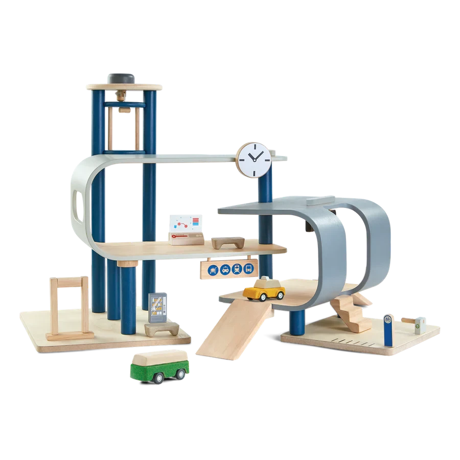 This Central Station can be connected to any other PlanToys transportation system. The lower building can be rotated to adjust the layout of building. Build a rail system for your trains, land your helicopter on the rooftop’s helipad, park your toy vehicles in the parking lot, bring people and animals up through the elevator, and so much more! This play set really stimulates a child’s imagination and invites them to explore transportation play freely. Nearly all areas of development are triggered here — particularly hand-eye coordination, problem solving, concentration ability, fine motor skills and creative thinkin
