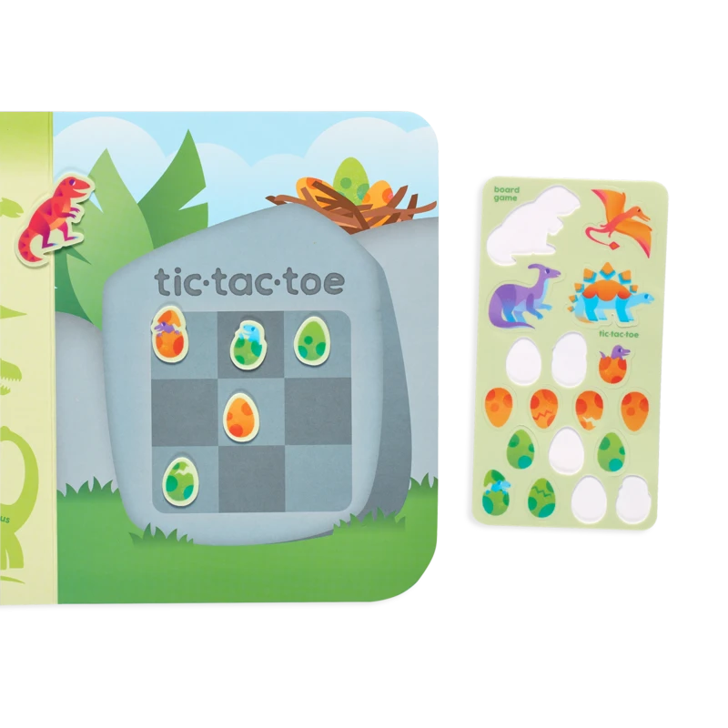 Whether you are traveling or in need of stay-at-home kids activities; this reusable sticker and activity book does it all. Imagine playing with cute dinosaur stickers with no mess. Daring Dinos Play Again Activity Book features a board game, match and learn, tic tac toe, and a scene board to fill with colorful dino stickers.