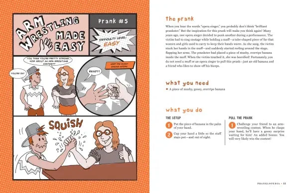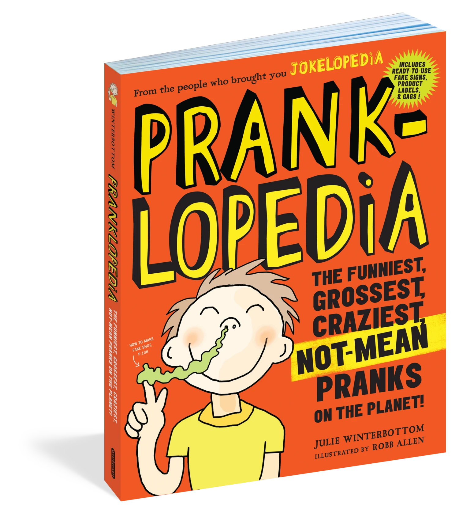 Pranklopedia is the young practical joker’s secret weapon, a boisterous collection of over 70 guaranteed-to-amuse (or annoy) pranks to be pulled on friends, siblings, and parents. Discover the Homework Hoax, the Squirting Blister, the Movie Popcorn That Grabs You Back. Pull classic pranks on your siblings, like short-sheeting the bed. Freak out your friends with food pranks: a self-peeling banana, “misfortune” cookies, or ice cream that will make them scream (here’s a hint—it involves instant mashed potatoes). And there are perfect pranks to pull on your parents, including a scheme to “freeze” the family computer.