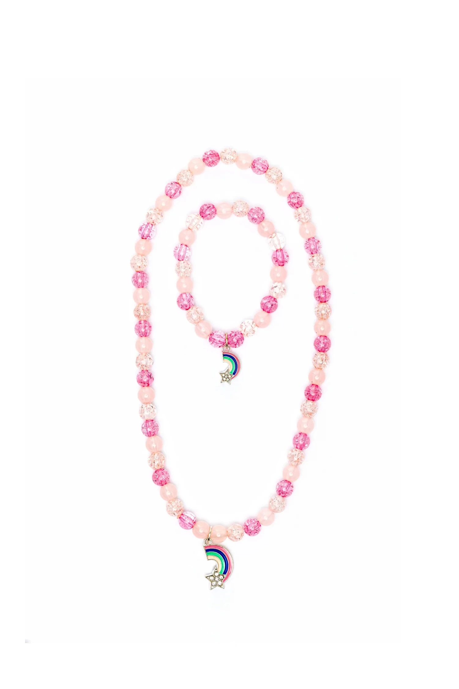 This necklace and bracelet set has various purple-toned beads and a rainbow charm with a bedazzled star.