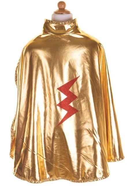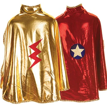 Be ready to save the world with this sharp reversible Made in Canada Wonder Cape! The cape features iridescent liquid knit fabric on both the radiant red and gold sides. Trimmed with gold bias and featuring a Velcro closure that allows for an easy-on-and-off experience for little ones. The red side features a blue panne circle and gold glitter star detail with the reverse gold side featuring a flaming red glitter lightning bolt. Inspired by the comic superheroes we love, get ready for a new adventure with this Reversible Wonder Cape!