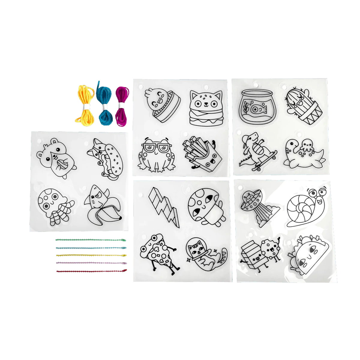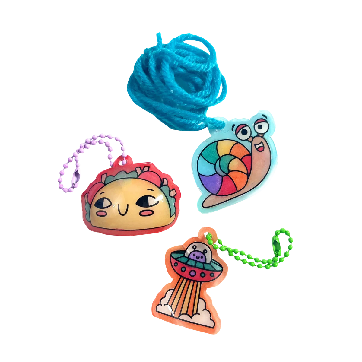 - Kit includes 20 pre-cut shrink plastic charms, 5 ball chains in red, yellow, green, blue, and purple, and 3 packs of cord in blue, yellow, and red