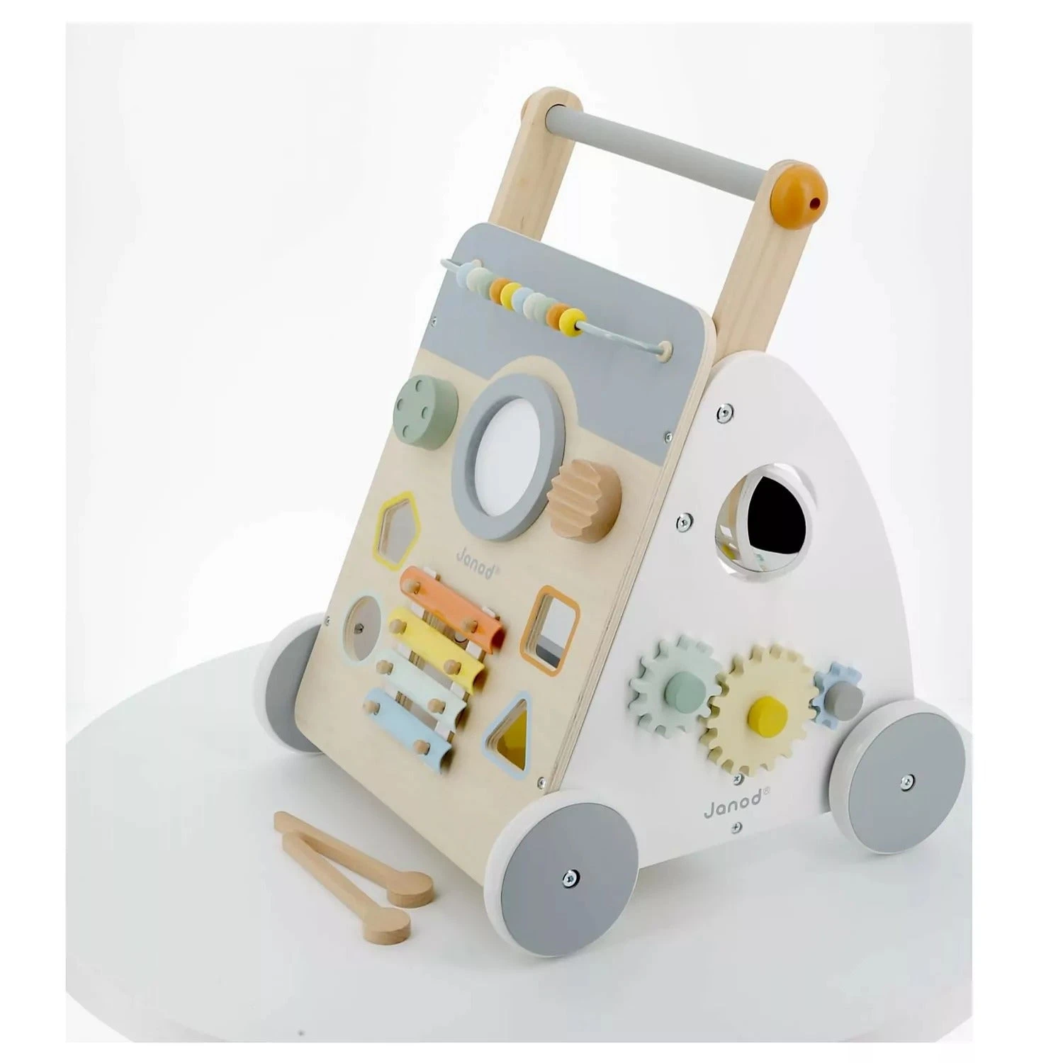 This beautiful multi-activity push-along trolley is great for helping children learn to walk. It’s suitable for children aged 12 months and over, and comes with an invisible, removable brake that allows you to stop and release the wheels as required, so you can control the speed of the trolley as your child learns. As well as helping your child get on their feet, the trolley also gives your child 9 different ways to test their motor skills and dexterity: an abacus, a shape box, a maze, gears, a rotary switch with built-in sound, a “scratchy” summary, a magnifying rotary mirror, a drum, and metal xylophone to develop their musical ear. And with its felt mat to reduce the noise of falling blocks and its silent wheels, our designers really have thought of everything!