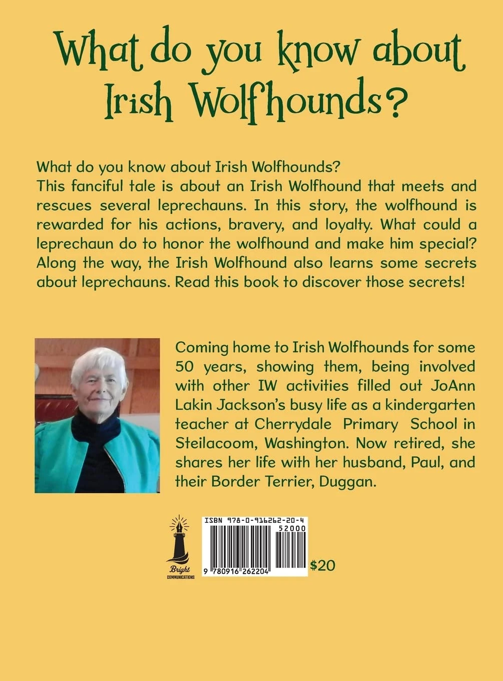 This fanciful tale is about an Irish Wolfhound that meets and rescues several leprechauns. In this story, the wolfhound is rewarded for his actions, bravery, and loyalty. What could a leprechaun do to honor the wolfhound and make him special? Along the way, the Irish Wolfhound also learns some secrets about leprechauns. Read this book to discover those secrets!