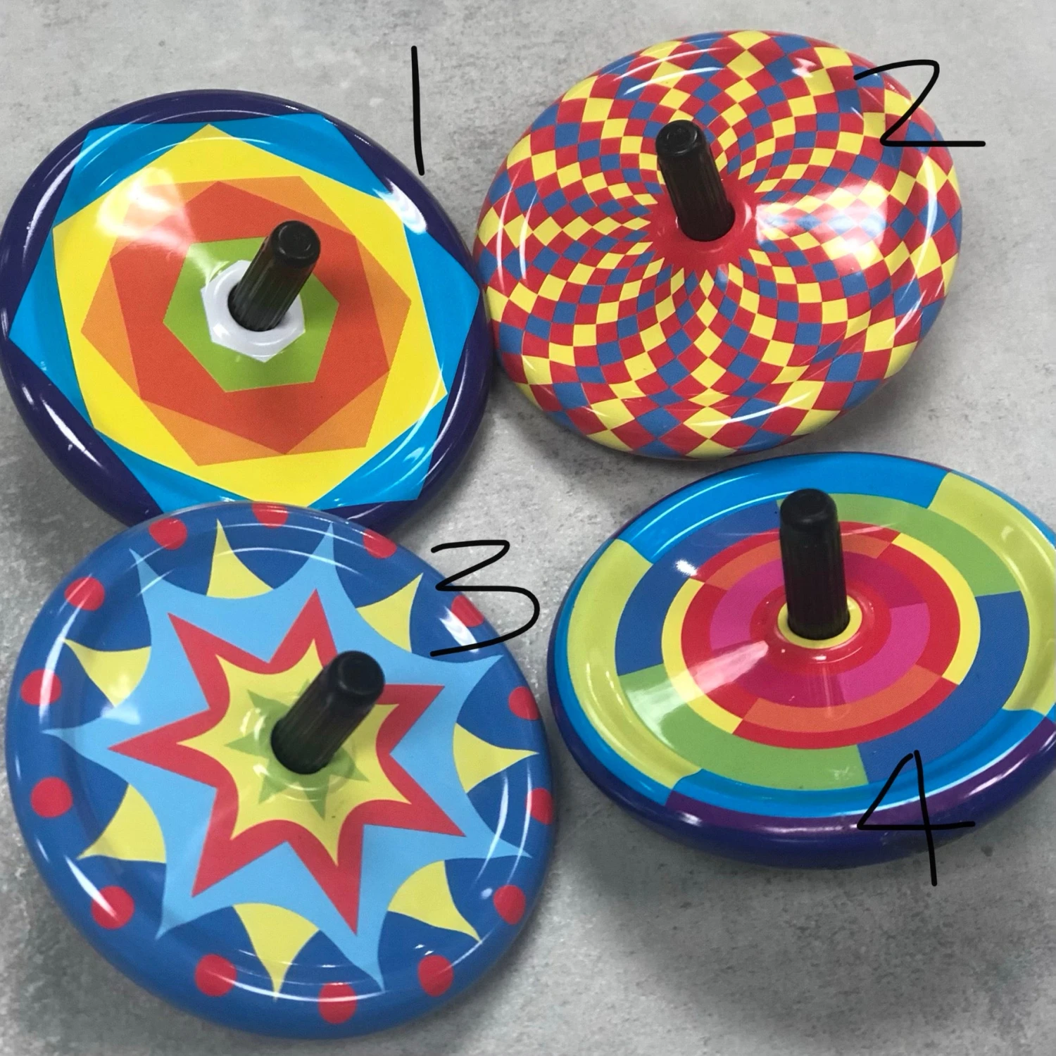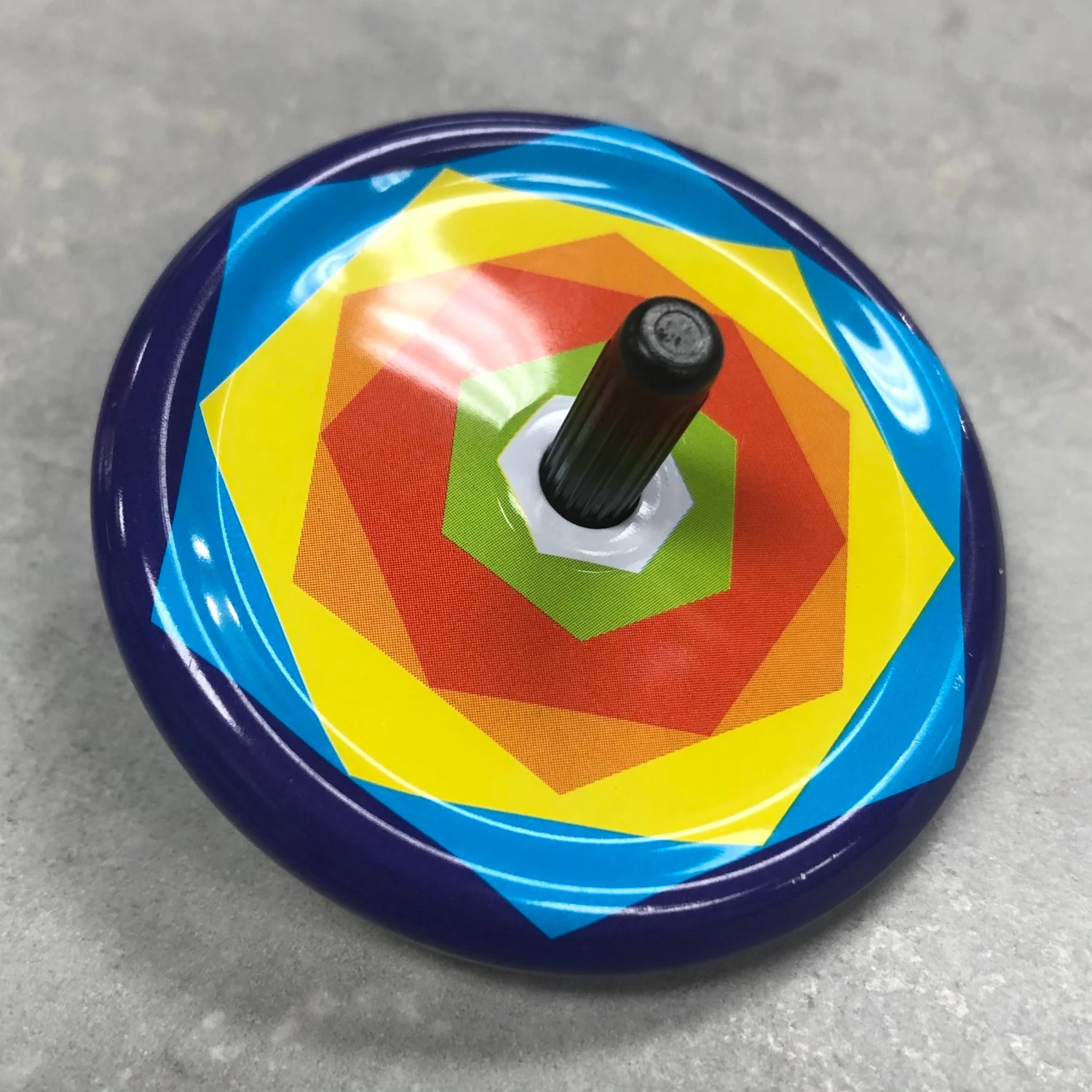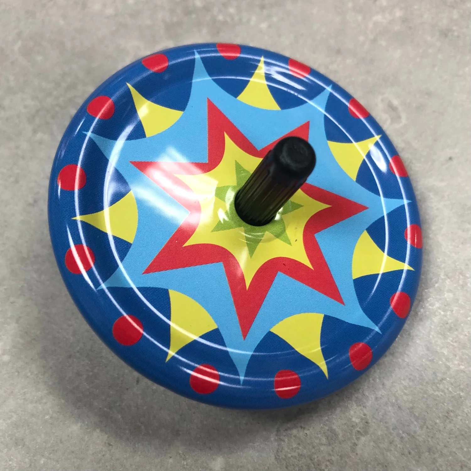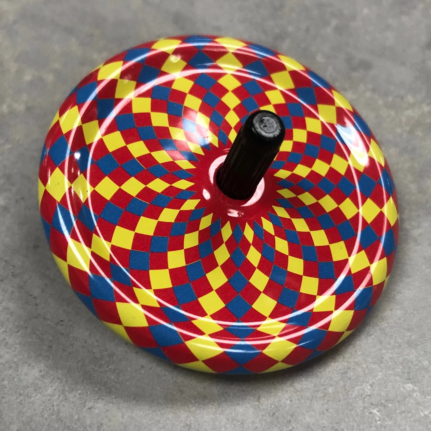 This teeny-tiny tin-top boasts the classic retro look! Each top appears to change color as they spin.