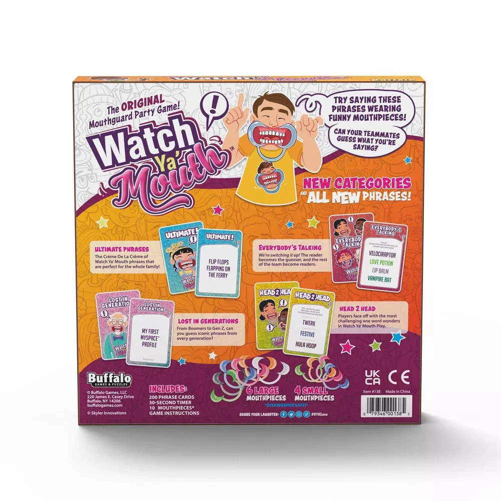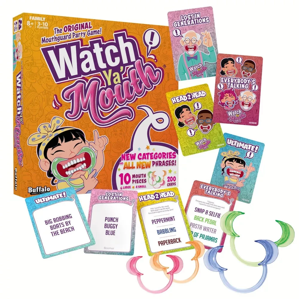 Watch Ya’ Mouth is The Authentic, Hilarious, Mouth-guard Party Game now featuring new content and categories! Teams of players, hampered by cheek retractors, attempt to read and interpret phrases from 4 unique card decks: Ultimate!, Lost in Generations, Head 2 Head, Everybody’s Talking.