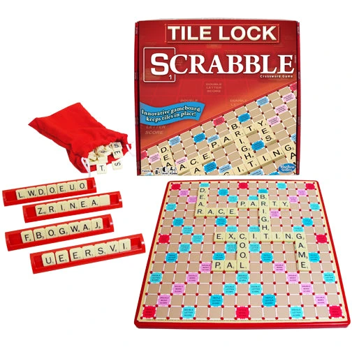 - Contents: Official plastic Scrabble gameboard with tile lock system, 100 plastic Scrabble letter tiles, 4 plastic tile racks, 1 drawstring tile bag and instructions.