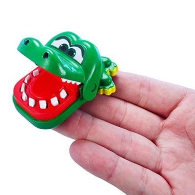 The world’s smallest version of the popular game of nerves and luck. Open the Croc’s mouth wide, and “examine” his teeth by pressing down on them one by one. But watch out! Be the player to press on the crocodile’s sore tooth and you’ll get chomped!