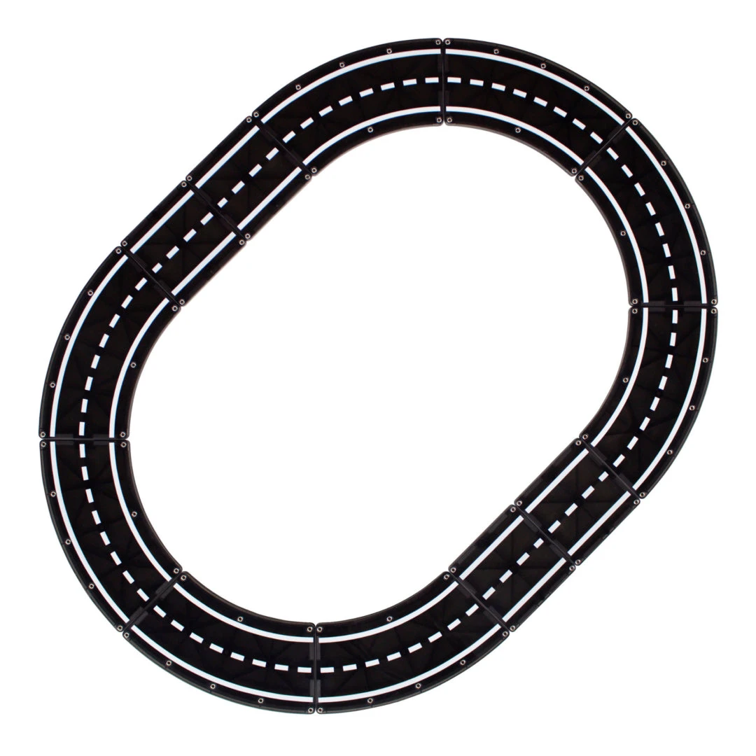 - Includes all the pieces you need to complete a perfect circle (8 Curves) or an oval racetrack (8 Curves + 4 Squares).